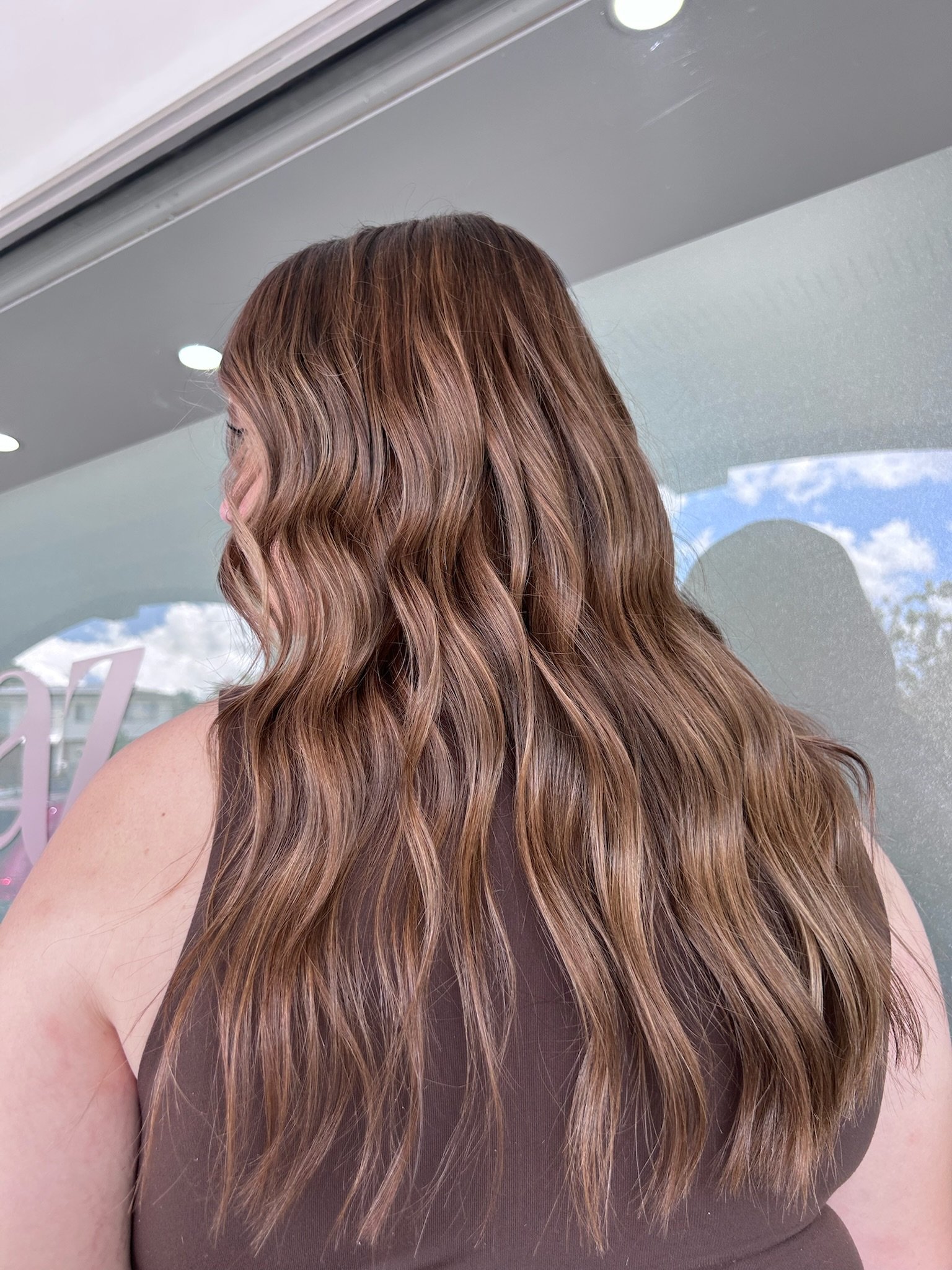 Balayage is a hand-painted technique where pieces of hair are lightened to create dimension and contrast. Unlike traditional foils, it doesn’t always start at the root. Some people want subtle, soft pieces of light throughout their hair. Others like more noticeable contrast between darker and lighter sections. How I paint the hair depends on your hair texture, thickness, and condition.