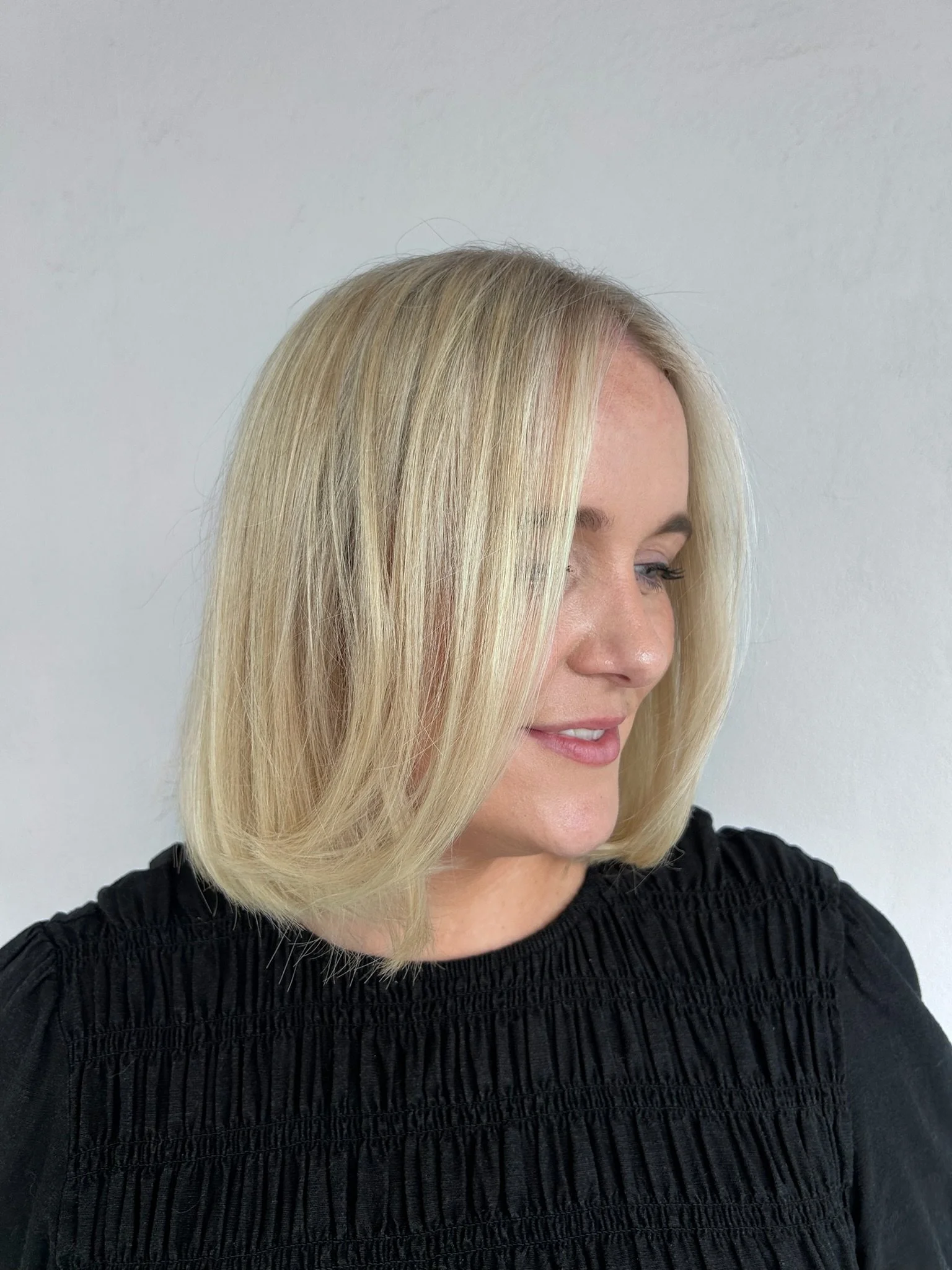 Some people like a softer, more lived-in blonde. That lets them go longer between appointments. Some people like an all-over blonde, which is brighter from root to tip and needs more regular upkeep. Others sit somewhere in the middle. When I create a blonde, I look at your hair history, how it responds to lightening, and what kind of maintenance will actually work for your life.